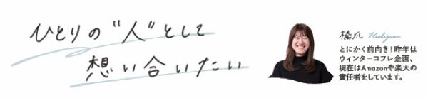 メンバー同士で「想い合う」ように、お客さまともお互いに「想い合い」ながら関係性を築いていきたいです。商品やサービスだけではなく、私たちhugkumi+だからこそ提供できる価値を感じていただけるよう、全力を尽くし続けます。