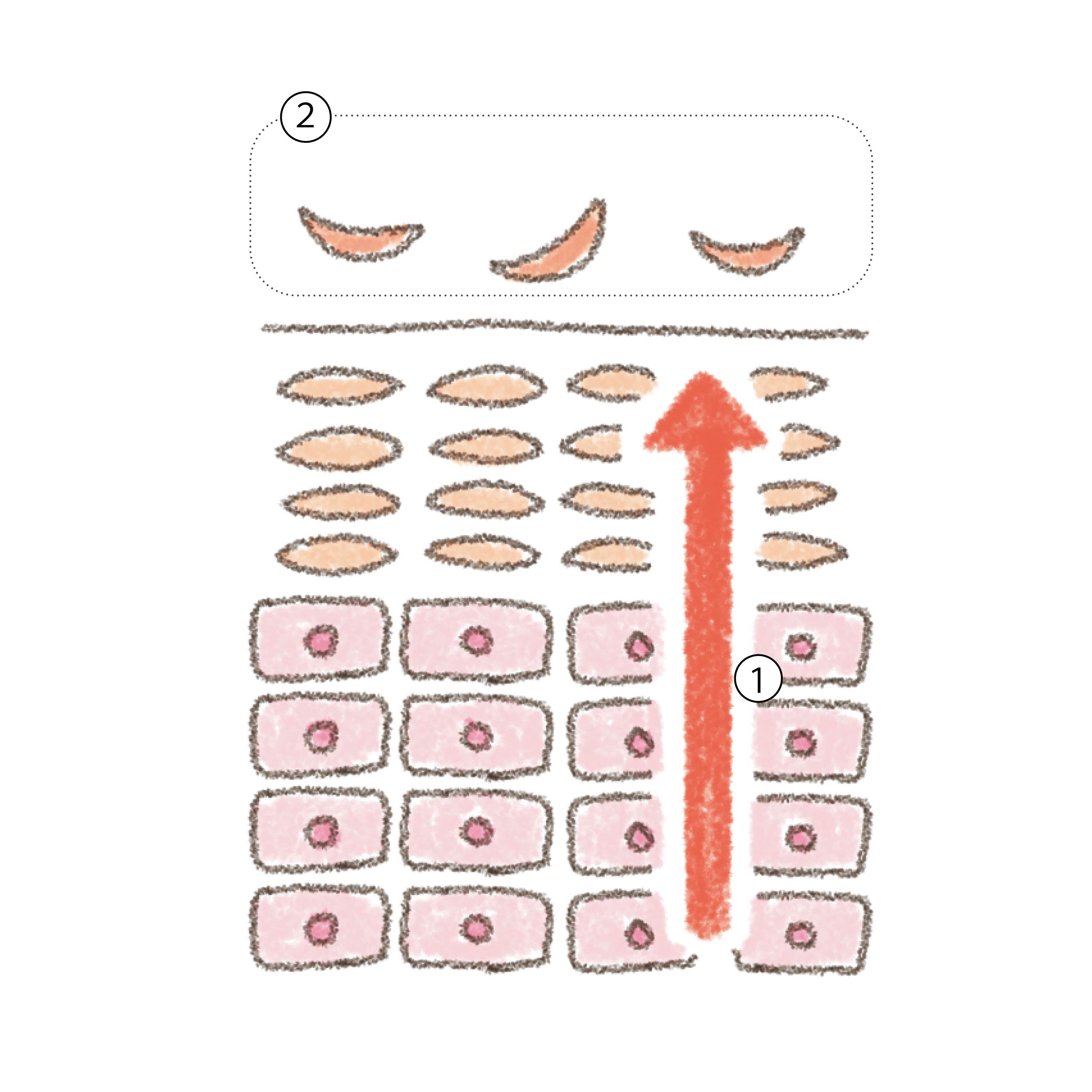 肌の生まれ変わりに3ヶ月かかるといわれているのは、肌のターンオーバーの仕組みが大きく関係しています。ターンオーバーとは皮ふ組織の一番表面、表皮で起こる細胞の生まれ変わりのこと。上図➀のように新しく生まれた細胞が角質層まで押し上げられ、自然と剥がれ落ちる上図➁までの期間を示しているんです。