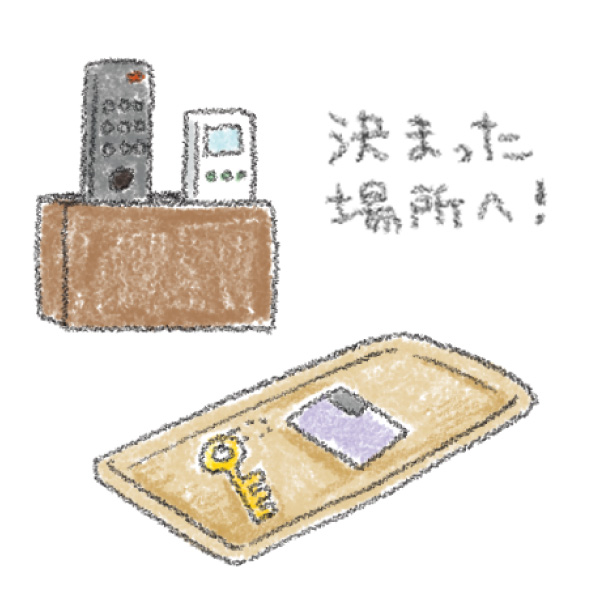 使用頻度が高ければ高いほど見失いがちになるため、毎日使うカギやスマホ、リモコンは定位置で管理すると◎。子供のお出かけ準備物も、定位置で管理することで片付けやお出かけの準備がスムーズになります。