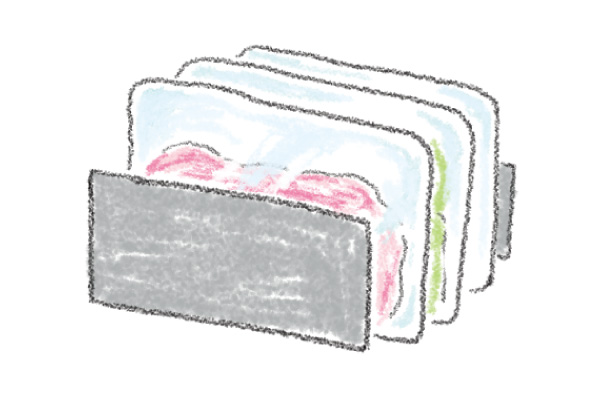 下から上に積み上げてしまいがちな冷凍庫は、食事が埋もれてしまいます。ブックエンドやファイルスタンドで冷凍庫内を仕切り、立てて収納することで見える化できます。