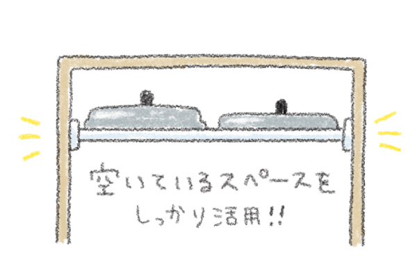 収納スペースの余白は突っ張り棒で活用できるかも。平行に2本の突っ張り棒を配置して簡易棚にすれば、鍋のフタやストック品のキッチンペーパーの保管に最適です。