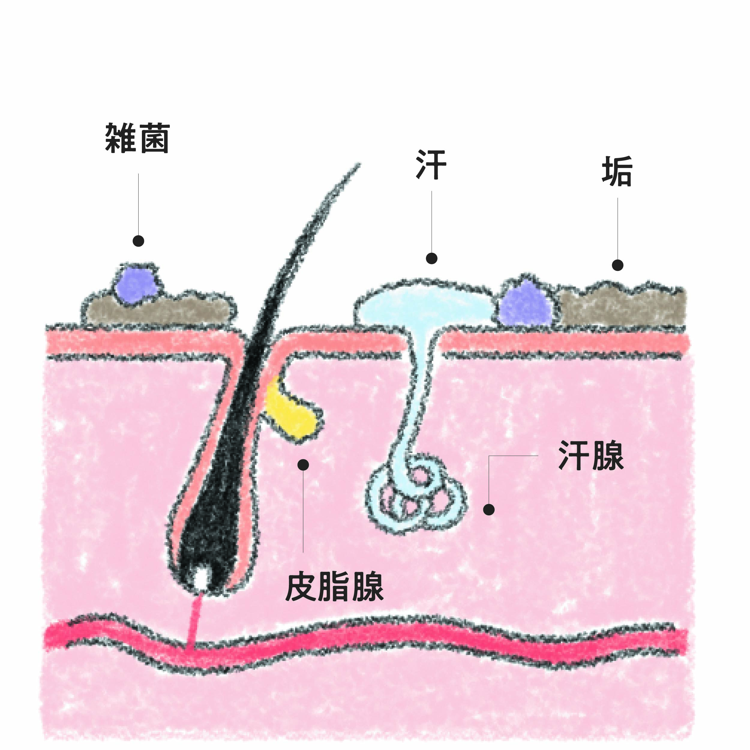 汗のニオイを生み出すのは、皮ふに住み着いている皮膚常在菌といわれる雑菌たち。普段は皮ふを健やかに保つために働いてくれていますが、皮脂や角質と汗が混ざったものを栄養源として増殖。そのときに発生する物質が汗のニオイの正体なんです。