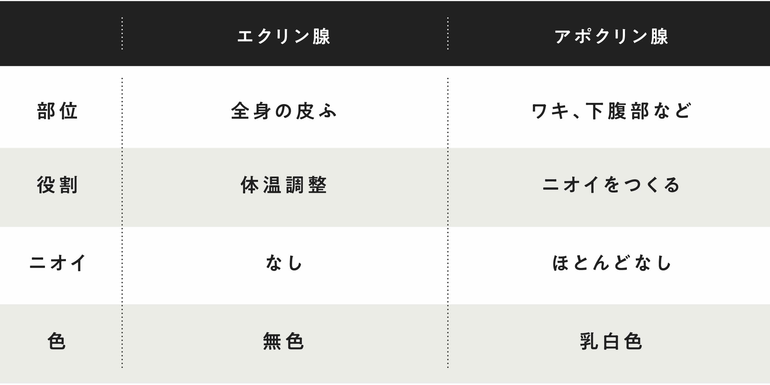 もともとはフェロモンの役割を果たしていたといわれていて、ニオイをつくることが役割だったアポクリン腺。通常汗腺からの汗にほとんどニオイはありませんが、アポクリン腺から出る汗は白く濁っていて、脂質やタンパク質などニオイのもととなる成分を多く含んでいるため、菌が分解するときに独特な強いニオイが発生しやすくなるんです。